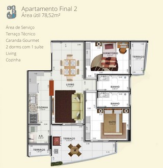 Apartamento com 2 quartos sendo um suÃte, sala, cozinha, 2 banheiros, área de serviço, garagem p/2 carros, varanda gourmet.